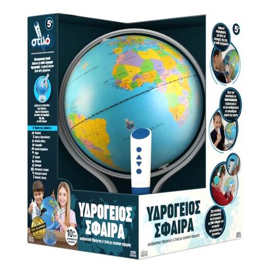 Η Υδρόγειος Σφαίρα είναι ένα ηλεκτρονικό, εκπαιδευτικό βοήθημα για παιδιά και μεγάλους, που μιλάει ελληνικά (10+ ώρες εκφωνήσεων). Λειτουργεί με το Διαδραστικό Στιλό (περιλαμβάνεται) και σου μαθαίνει τα πάντα για τον κόσμο μας: ήπειρους, χώρες και πρωτεύουσες, γεωγραφία, ιστορία, πολιτισμό κτλ.